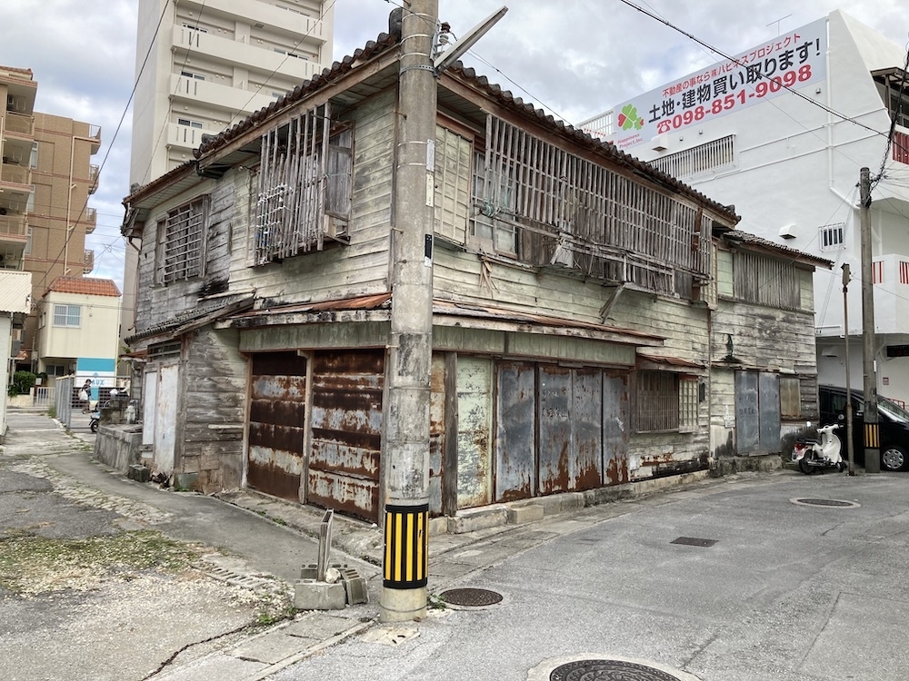 古い家の横に屋根無し駐車場が隣接していて、数人が(おじさん)そこに立っている。