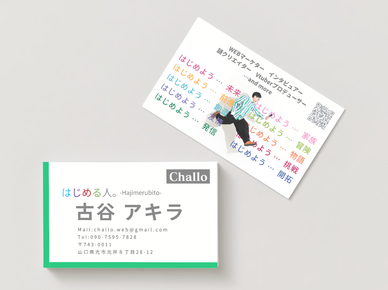 グラフィック古谷アキラさんのキャッチなど WEBマーケーターなどのお仕事をされている古谷アキラさんのキャッチフレーズ「はじめる人」や、タグライン「はじめよう…○○」。 Twitterヘッダー案、名刺デザイン案などを制作しました。