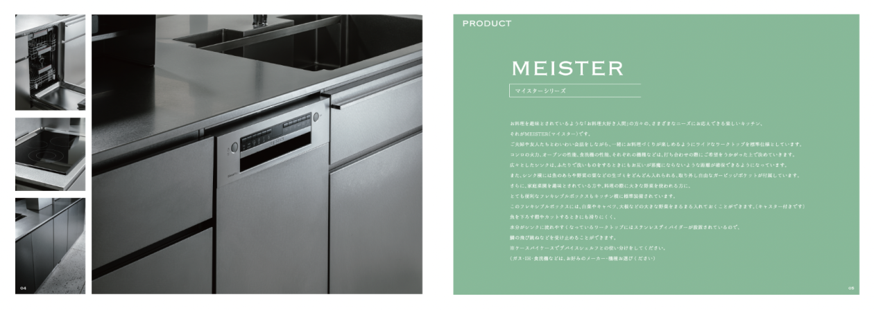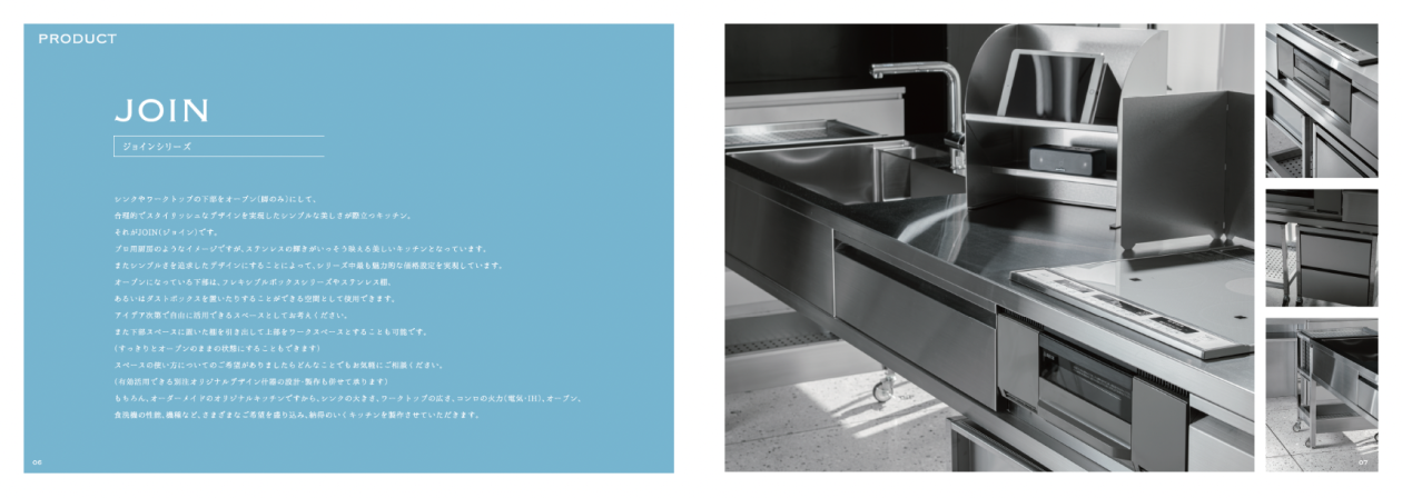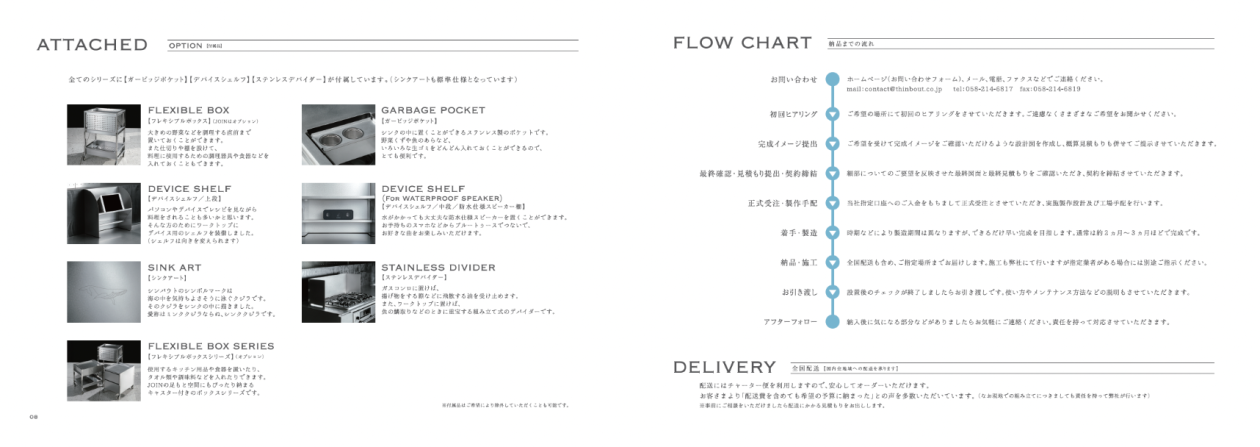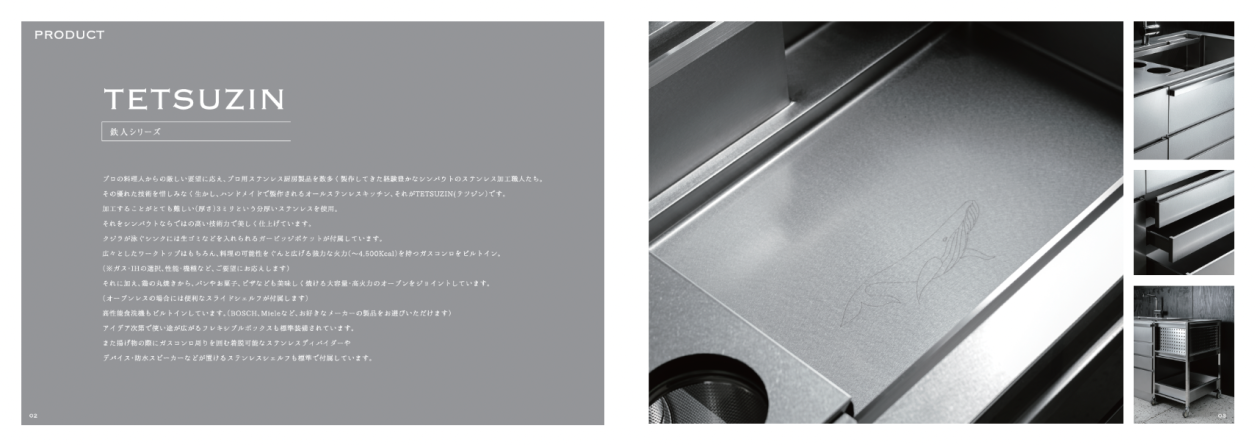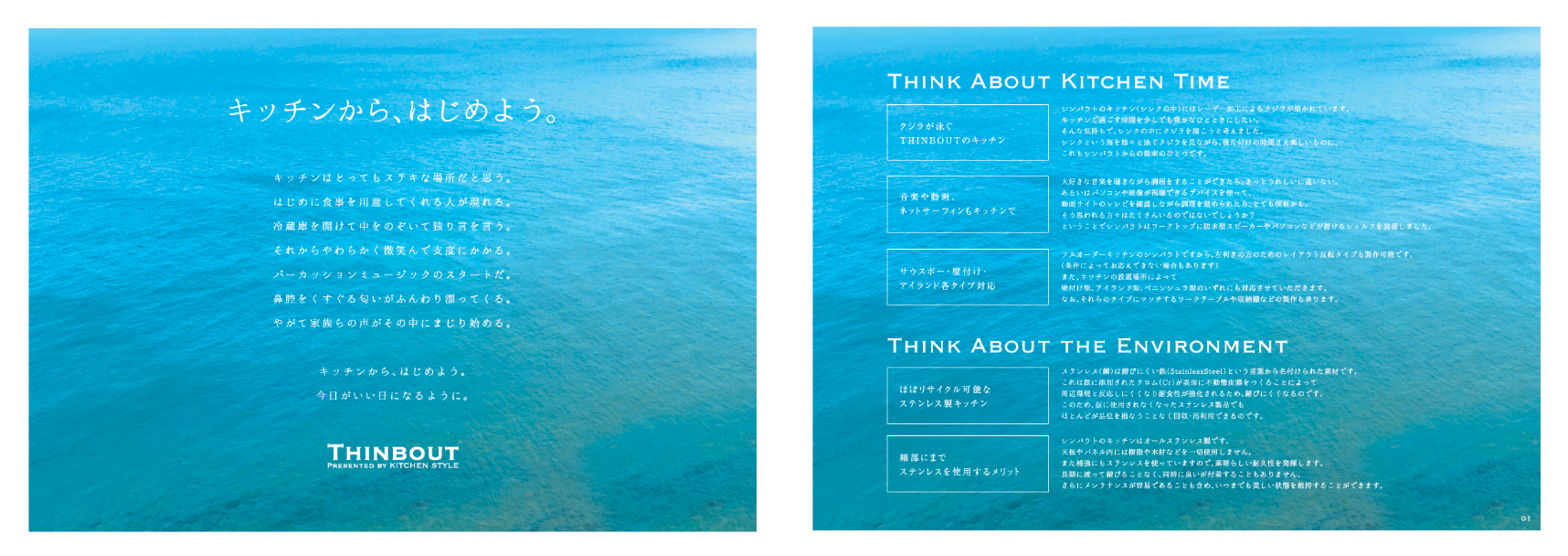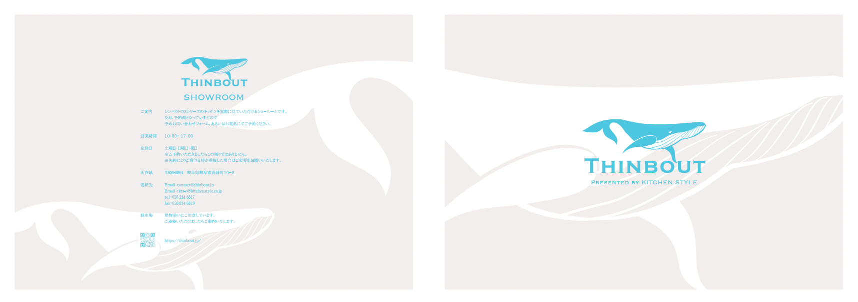 グラフィックステンレスキッチンブランド THINBOUT(シンバウト) パンフレット アイキャッチャーはクジラです。 ブランド名、VI、MVV策定、パーパス決定、プロダクト開発、ツール制作、プロモーション、広告・PRまで行った クリエイティブ・ブランディングの一部です。
